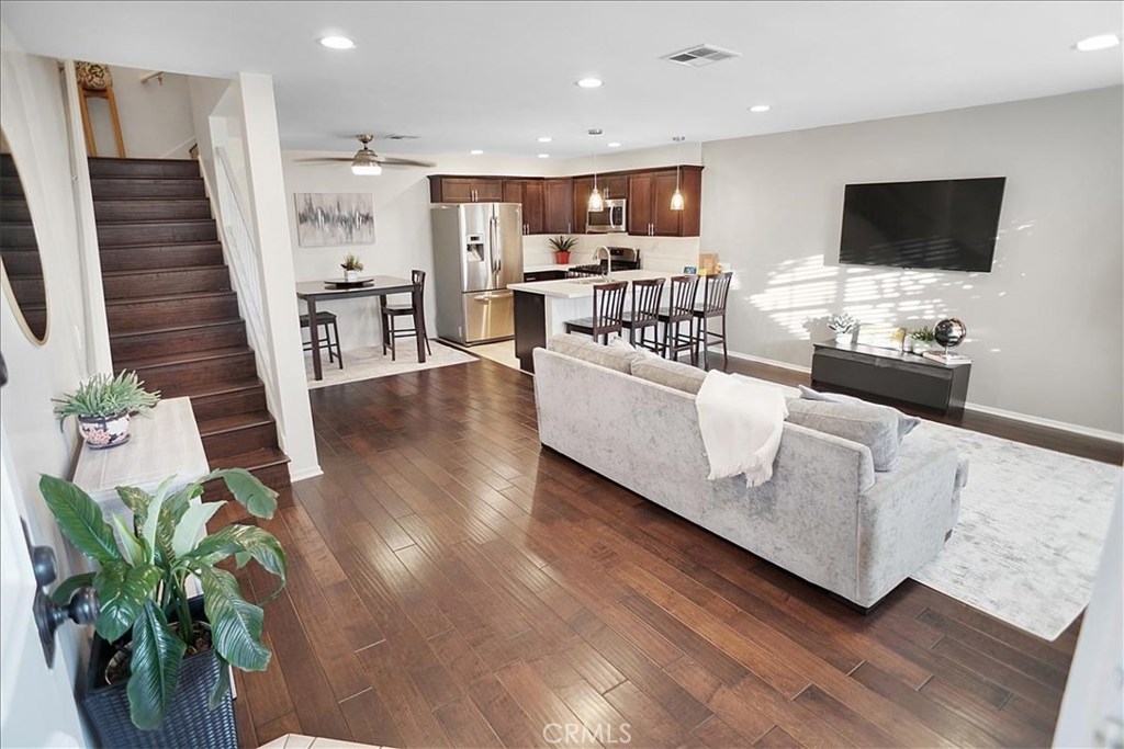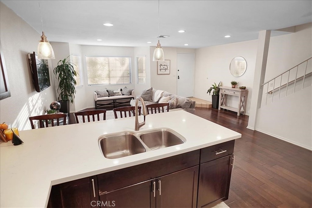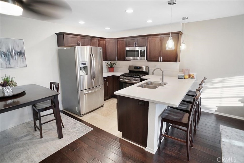 Beautiful true pride of ownership townhome! Home offers many upgrades and is truly a delight to show to your townhome buyers in Sylmar. Many recent upgrades and remodeling including upgraded quartz kitchen counter tops, kitchen cabinets, engineered dark wood flooring, upgraded designer lighting, stainless steel gas range, built in microwave, designer ceiling fan in dining area, breakfast bar, spacious livingroom with designer engineered flooring, stairs, upstairs there's remodeled bathroom, laundry area upstairs, and spacious mastersuite with two closets and good size masterbath. The patio shows like a model with relaxing sitting area, area for BBQ, lush plants and custom brick section. Enjoy entertaining in cozy private patio. Two car side by side private garage. This complex shows pride of owners with private pool, gated entrance and drive by security daily. The Brooktree shows well maintained. What a pleasure to show a must see on your buyers list.
