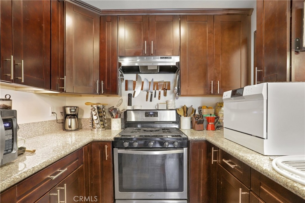 Located in the desirable Kingsbury complex, this upper-level end unit features 2 bedrooms and 1 bathroom with 864 sq ft of well utilized living space. Through the front door you find an open concept living room and dining room, both with vaulted ceilings that create a spacious feel, and a nice sized kitchen that is fitted with granite counters and has a pull-up bar area for eating. The vaulted ceilings continue in each of the bedrooms, enhancing the living space, and one of the bedrooms has a built-in murphy bed frame making it easy to use this as a flex space. In the hallway is the entrance to the nicely decorated full bath that has a tile shower, granite vanity counter, and an additional storage area. This home also offers a 2 Car Tandem Garage with a private washer & dryer closet conveniently located at the ground level. The community is nicely landscaped with lawn, greenbelts and walkways and offers two gated swimming pool, hot tubs, and a play area for everyone to enjoy. This property is close to shopping centers, parks, and provides easy access to local freeways.