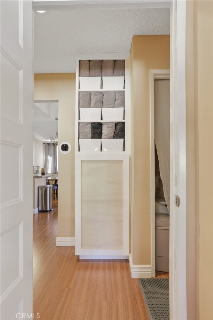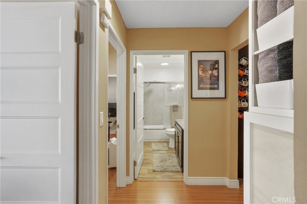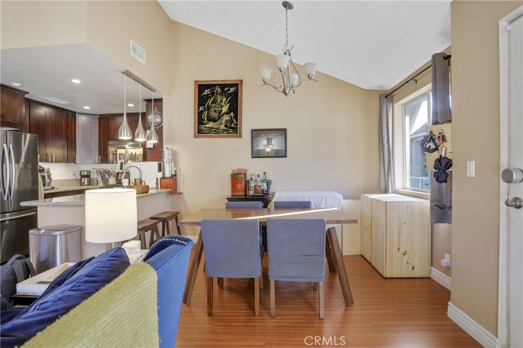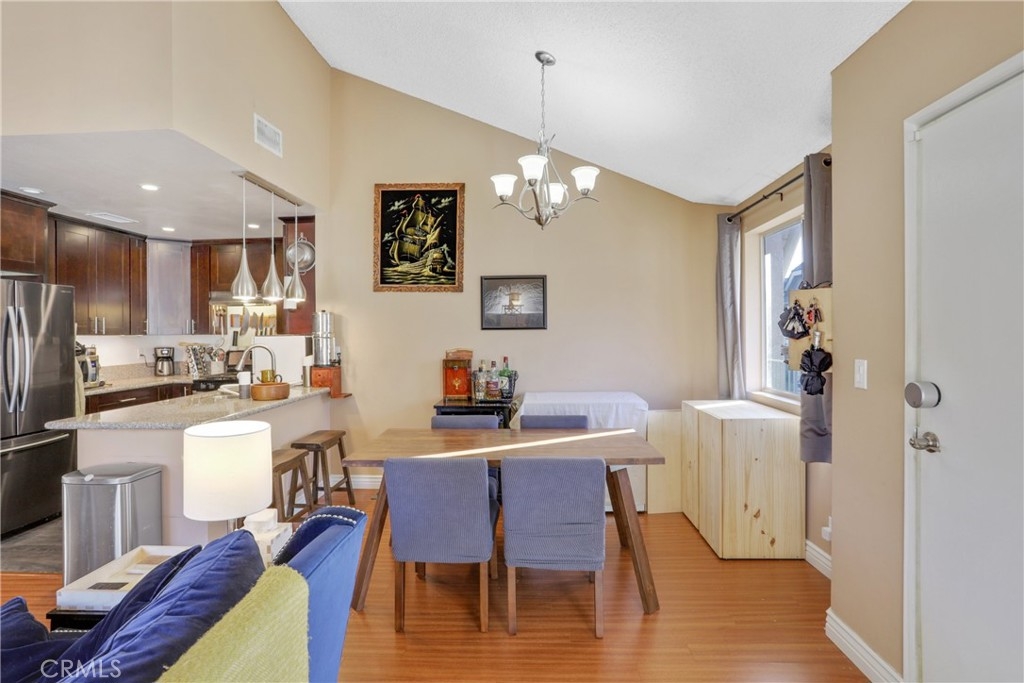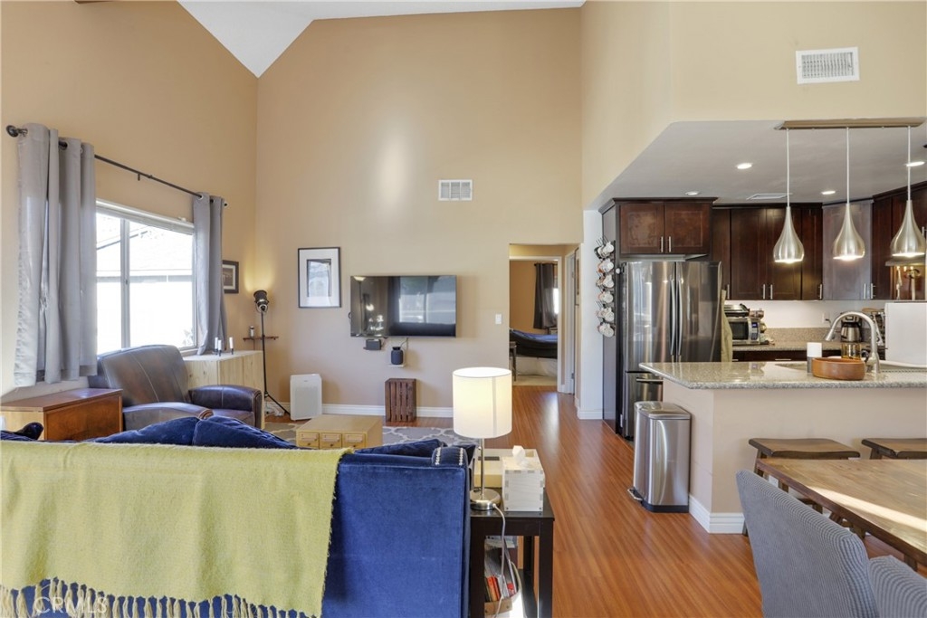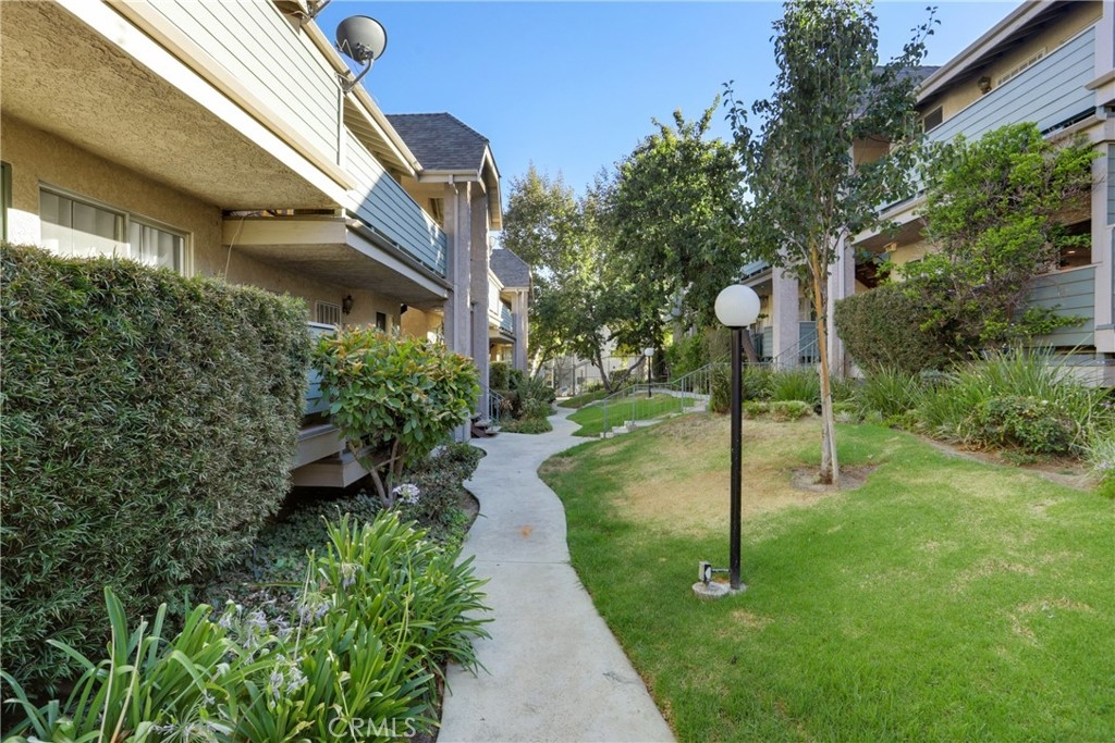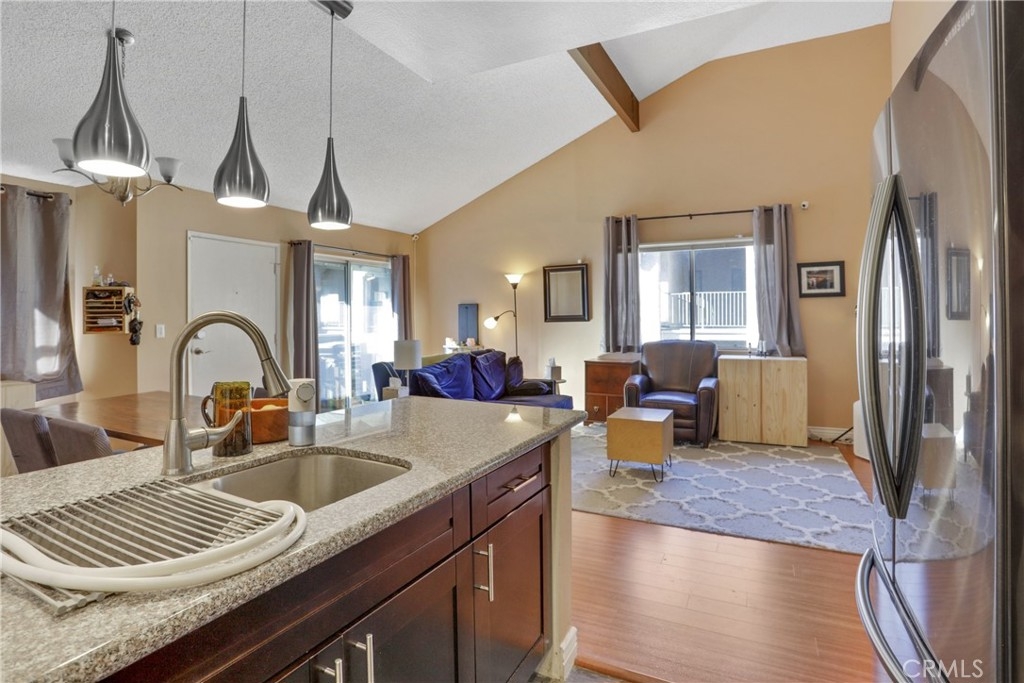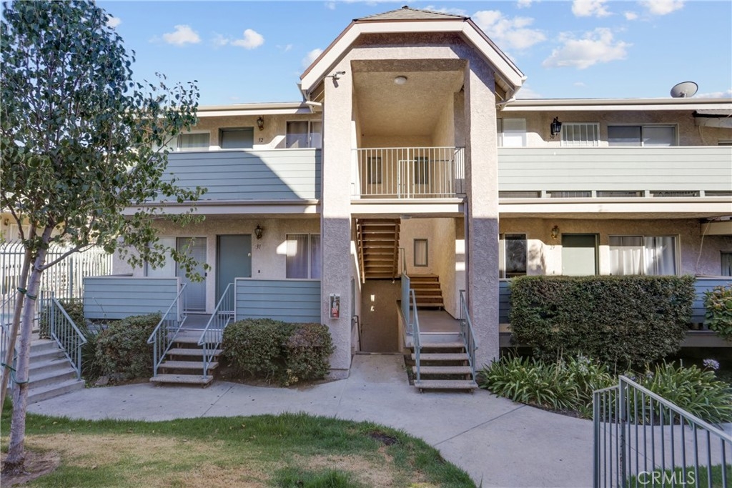 Located in the desirable Kingsbury complex, this upper-level end unit features 2 bedrooms and 1 bathroom with 864 sq ft of well utilized living space. Through the front door you find an open concept living room and dining room, both with vaulted ceilings that create a spacious feel, and a nice sized kitchen that is fitted with granite counters and has a pull-up bar area for eating. The vaulted ceilings continue in each of the bedrooms, enhancing the living space, and one of the bedrooms has a built-in murphy bed frame making it easy to use this as a flex space. In the hallway is the entrance to the nicely decorated full bath that has a tile shower, granite vanity counter, and an additional storage area. This home also offers a 2 Car Tandem Garage with a private washer & dryer closet conveniently located at the ground level. The community is nicely landscaped with lawn, greenbelts and walkways and offers two gated swimming pool, hot tubs, and a play area for everyone to enjoy. This property is close to shopping centers, parks, and provides easy access to local freeways.