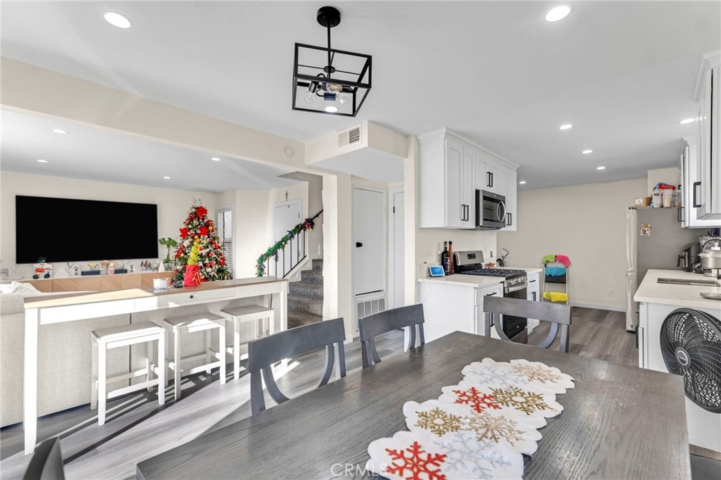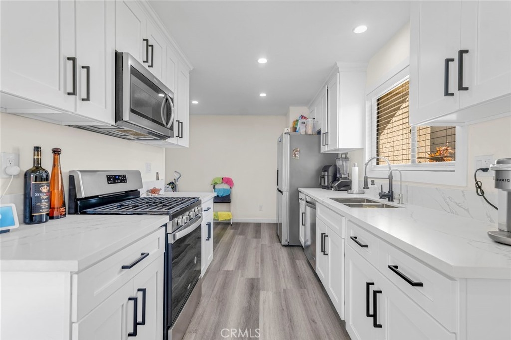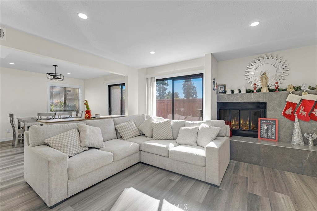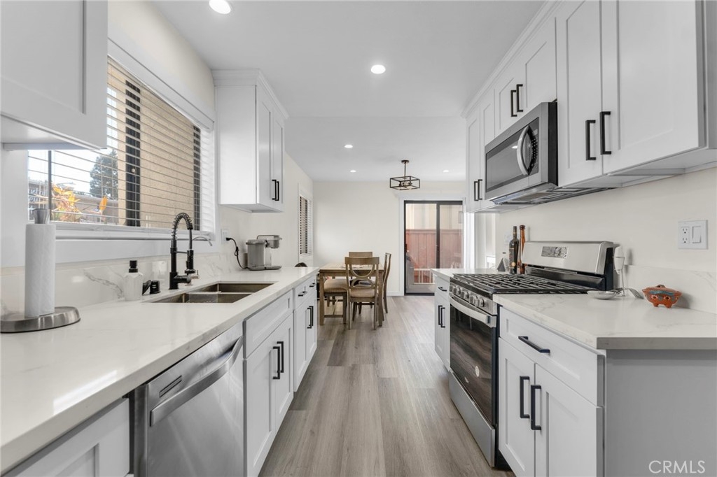 Experience the perfect blend of modern elegance and comfort in this impeccably updated two-story townhouse, offering 3 bedrooms and 2.5 baths. Boasting a thoughtfully designed open floor plan, the home is bathed in abundant natural light, accentuated by recessed lighting and sleek vinyl flooring that flows seamlessly throughout. The living room serves as a cozy retreat, complete with a charming fireplace for intimate gatherings. The newly remodeled kitchen is a chef's dream, featuring luxurious quartz countertops, high-end stainless steel appliances, and ample storage to inspire culinary creativity. Spa-like bathrooms have been tastefully upgraded, combining style with functionality. The spacious master suite serves as a tranquil haven, complemented by generously sized guest bedrooms that cater to family or guests. Step outside to enjoy the privacy of an enclosed patio, perfect for relaxing or entertaining. Nestled within a well-maintained community, residents can indulge in amenities such as a sparkling pool. Situated in a prime location, this home is near major freeways (5, 118, 210, 405), as well as public transportation, ensuring effortless connectivity. This is a property you won’t want to miss—schedule your visit today!
