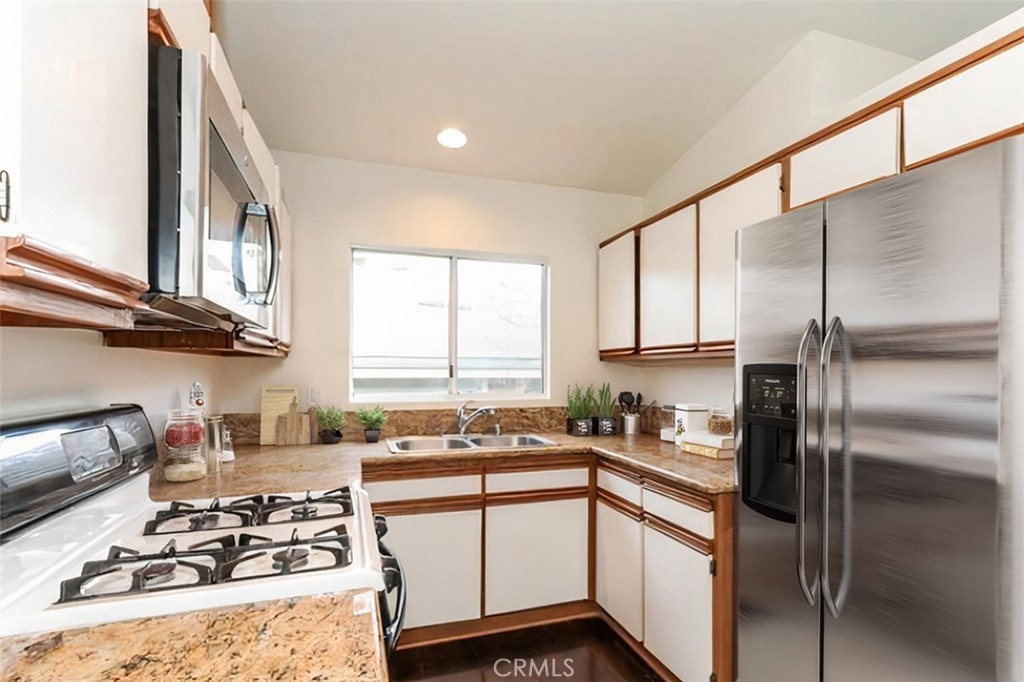 This well-maintained 2-bedroom, 2.5-bath townhome is in the sought-after Shadow Mountain Terrace community. Offering 922 sq. ft. of living space, this home provides comfort and convenience on a peaceful, tree-lined street. Inside, vaulted ceilings and natural light create a bright and open atmosphere. The kitchen features durable countertops and tiled flooring, offering style and functionality. The living area leads to a private outdoor patio, perfect for relaxation or hosting guests. Upstairs, two spacious primary suites each feature a full bathroom. A convenient half bath is located on the main level. The home includes newer water heater, new A/C unit, installed less than a year ago, and has a laundry area located in the two-car garage with direct access. Close to Hansen Dam Recreation Center, hiking trails, a golf course, and other local amenities, this townhome offers a wonderful living experience in a prime location.