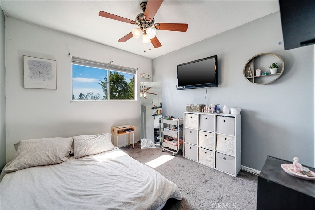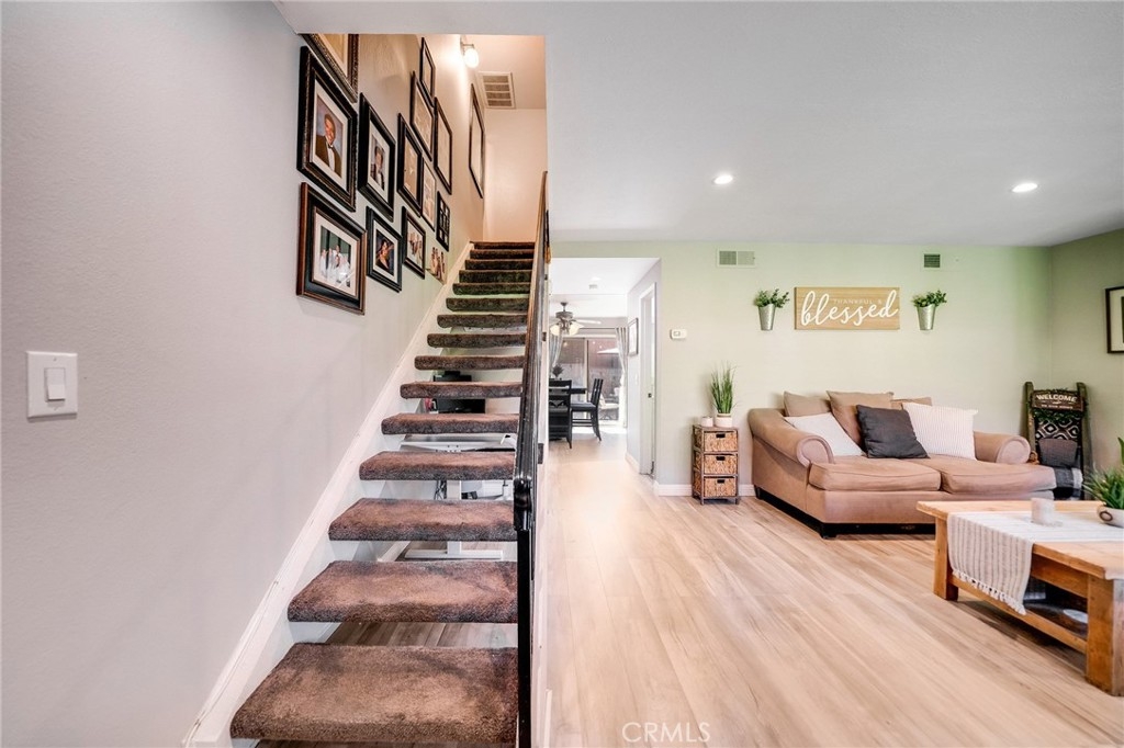 This is your chance to own a beautiful 3-bedroom 3-bathroom townhome nestled away in a quiet community right off the 210 freeway. You will love the open floor plan which offers plenty of natural light and vinyl wood flooring. The living room features a fireplace, recessed lighting, and plantation shutters. The half bath is located off the hallway for guests. The Dining Area has a ceiling fan and sliding door that leads to a quaint back patio that has direct access to a detached two-car garage. This spacious kitchen is perfect for entertaining and cooking. It includes tile countertops, stainless steel appliances, a pantry, and plenty of cabinet space. The laundry room is conveniently located off the kitchen, equipped with storage shelves, a new water heater, and room for a side-by-side washer and dryer. Upstairs features 3 bedrooms with recently updated carpeting and ceiling fans. The 3 bathrooms have been recently updated and fitted with tile flooring. The master suite comes with three closets, a private bath, and an enclosed walk-in shower. The unit is situated in the rear interior of this beautifully landscaped and well-maintained complex. Move-in ready!