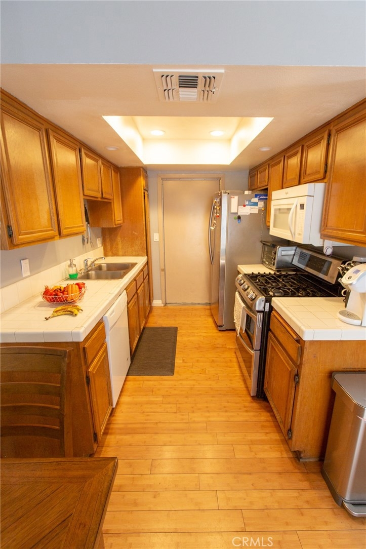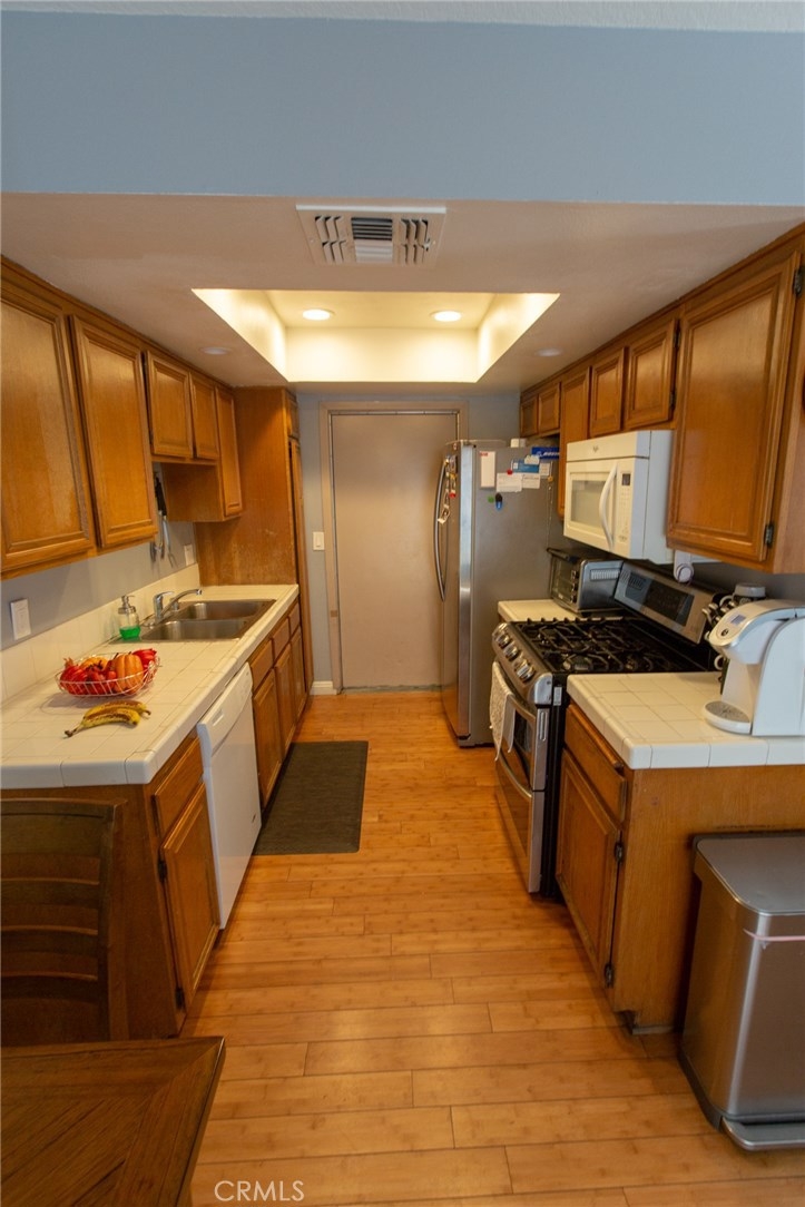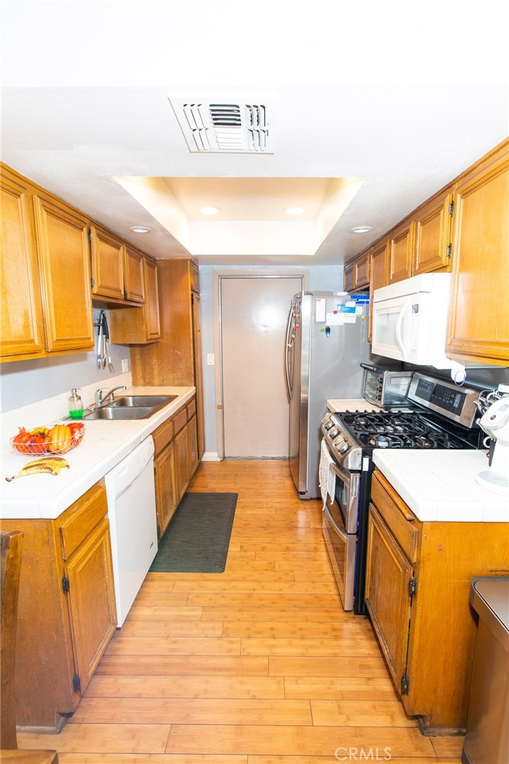 Welcome to this beautiful 3BD/3BA gated community townhouse in Sylmar! This welcoming corner lot townhouse (Only one shared wall!)features a spacious 1,317sqft, a foyer with high ceilings, a 2 car garage, central AC/heating, hardwood floors on the first floor, newer flooring upstairs, and a spacious private patio all in a serene and airy home. Inside, you will find natural light resulting from the large and plentiful windows. The kitchen features ample storage space, natural cabinetry, and well-maintained tiled flooring and countertops. The floor plan flows well into the dining area and family room, perfect for entertaining guests, with access into the back patio through the large sliding doors in the dining area. The 1st-floor living space is open-concept, inviting and spacious. The 2nd floor contains all the bedrooms, enabling further privacy. The spacious master bedroom features vaulted ceilings, a gorgeous large window, and a large private master bathroom. The other two bedrooms are just as large and almost identical to the master bedrooms features - perfect for a growing family. The private patio features high garden walls for privacy, great for family gatherings. The Community also features a sparkling swimming pool and jacuzzi. This property is conveniently located to local supermarkets, shops, and restaurants. Nearby schools include Sylmar Elementary, Olive Vista Middle School, and Sylmar Senior High.
