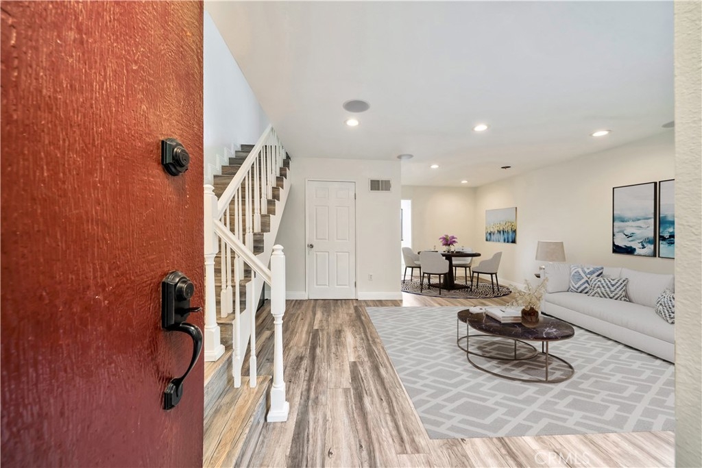Two Story Condo located in the Benco Community in Sylmar. This 2-bedroom, 2-bathroom home was recently updated with new kitchen appliances, new hardwood flooring throughout the main level, newly installed wood flooring on stairway, newly installed carpet in bedrooms, fresh paint throughout, and many other upgrades including recessed lighting. The main level features the living space with a half bath, built in audio surround system, a nice sized kitchen with granite countertops and sliding glass doors leading out to your own private patio space. The living room features a cozy gas fireplace for those extra cool winter evenings. Upstairs you will find the two bedrooms and a full bath. This unit comes with two covered parking spaces, and a community pool! Come check out all the features this home and community have to offer.