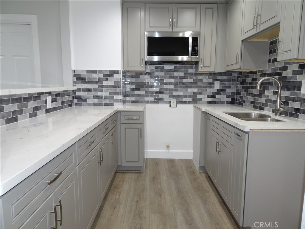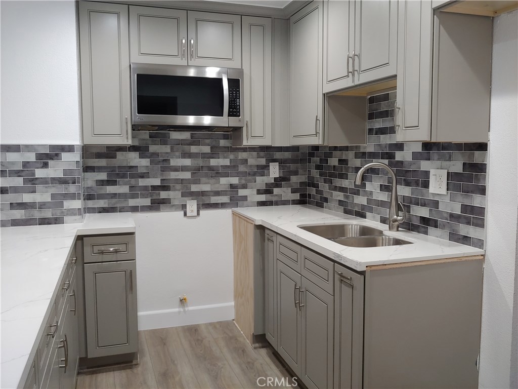 No Further showings, offers over asking price, seller will sign-off tonight. End unit with balcony and additional 4th bed/den. Complete remodel, new laminated hardwood flooring, doors, fixtures, new interior paint, new lighting, new kitchen cabinets, stone counters, tile back splash and stainless steal appliances. Bathrooms with new tile, cabinets and double sinks in master. Living room with plenty of windows and natural light with stone fireplace. New water heater, garage parking underneath unit, complex has pool, spa and visitor parking. Easy freeway access to 210 freeway, near by shopping, parks and schools.