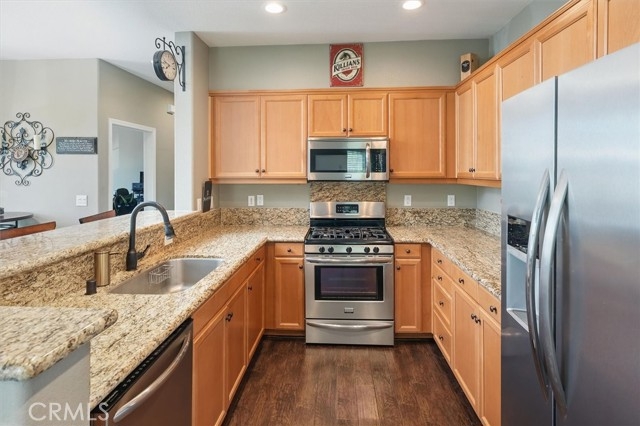 Sweet end unit Townhome in the Fairways at Legends of the Cascades nestled in the Foothills of Sylmar offering resort-like grounds that include a swimming pool, spa, playground, BBQ area and 24 hr. security. Surrounded by mountains, this turn-key townhome is ready for you! Downstairs foyer leads you up a staircase to an open floor plan living room & dining area with 9 foot ceilings and 2 balconies with mountain views. Chef's kitchen features granite counter tops, stainless steel farm sink, built-in stainless steel appliances, wood cabinetry, counter top bar & recessed lighting. 2 spacious bedrooms and bathrooms. The Primary bedroom opens to a private patio and has a walk-in closet adjacent to the private upgraded full bathroom. The secondary bedroom offers wall to wall closet with mirrored doors. The guest bathroom is also updated and has a bathtub/shower. This beautiful home has espresso wood laminate flooring throughout, custom paint, recessed lighting, indoor laundry and a 2-car attached garage. Perfectly located right off the 5 and 14 freeways! FYI - this home has a VA Assumable Loan!