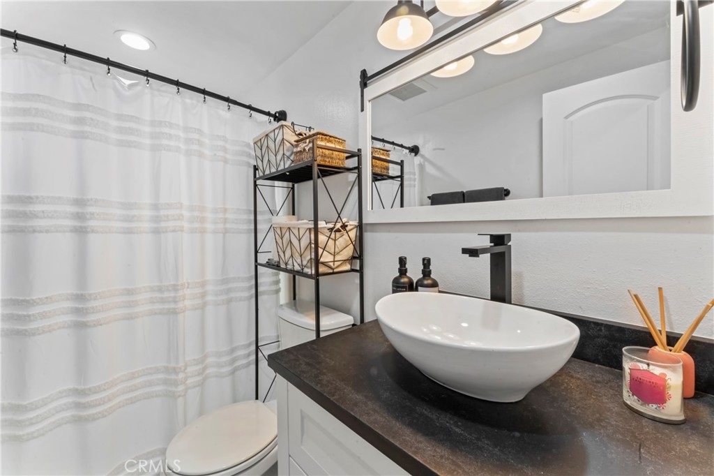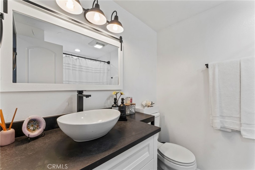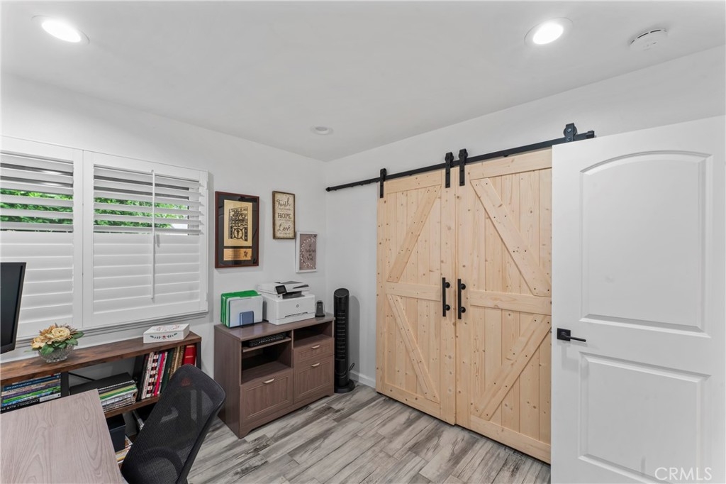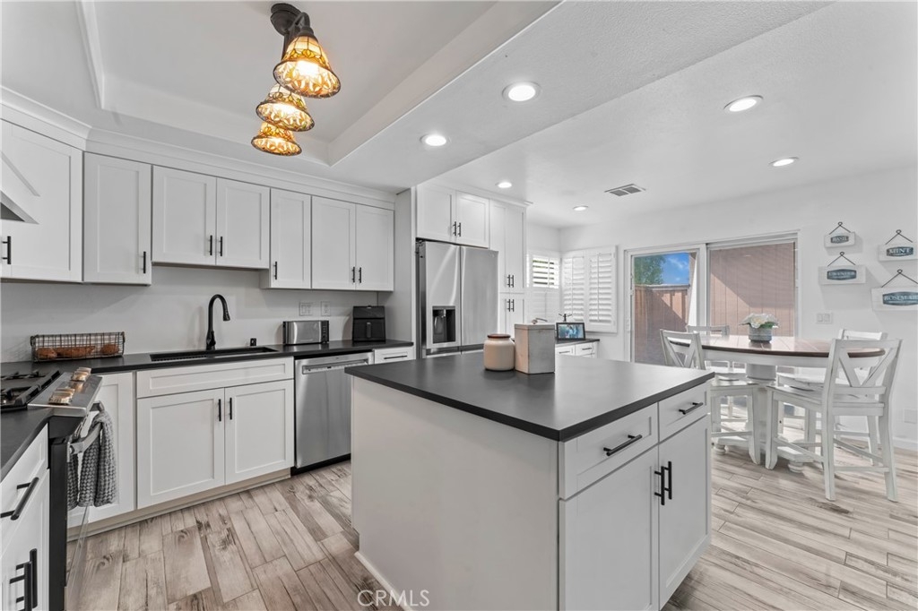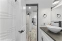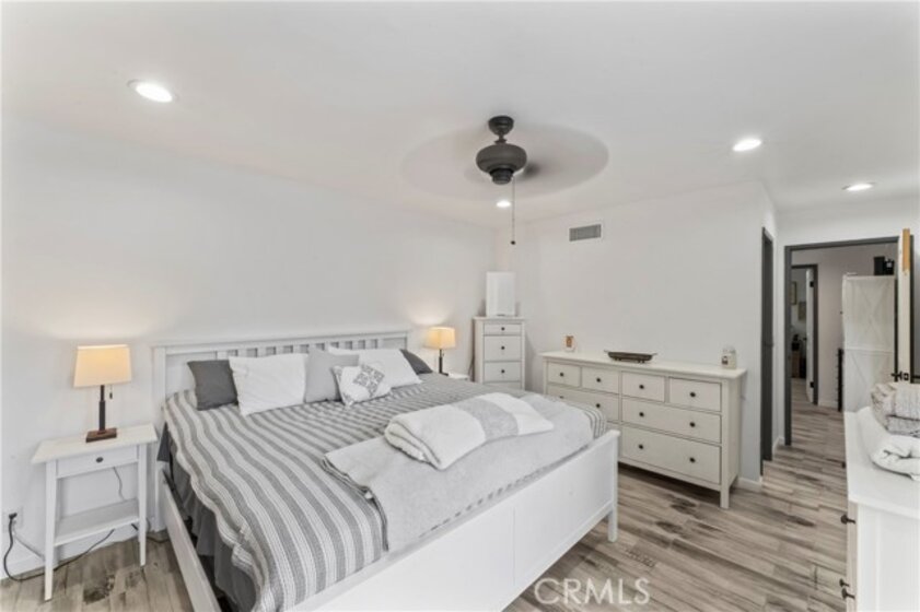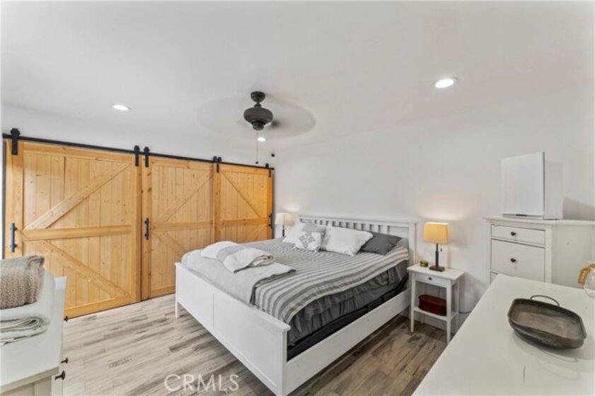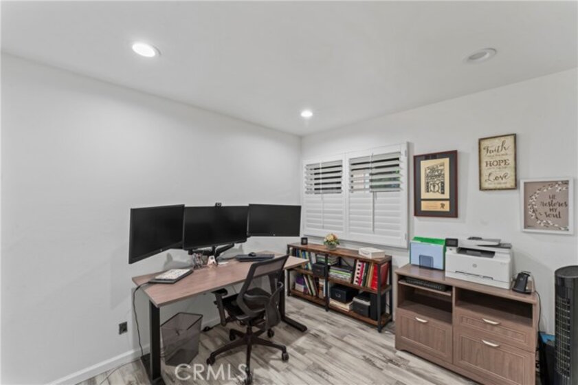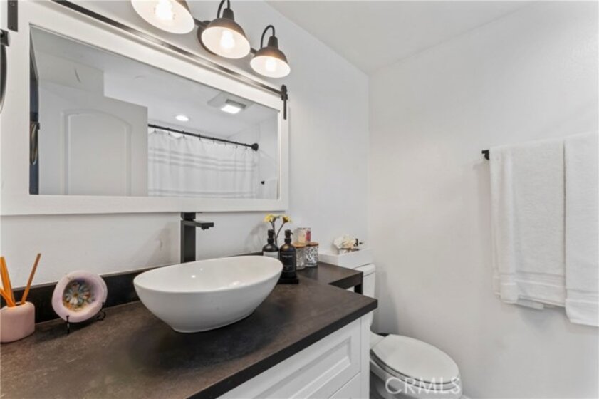 Rare Single story remodeled 2+2 Townhome with direct access oversized Garage & private Patio! Step into this beautifully upgraded home where modern design meets thoughtful craftsmanship. This turnkey 2+2 home blends modern upgrades, smart features, and timeless finishes—ready for you to move in and enjoy. Featuring elegant Duttonwood Ash matte ceramic tile flooring throughout, this residence offers a seamless, contemporary feel enhanced by new baseboards, fresh designer paint, recessed lighting, updated interior doors, and refined electrical finishes. Custom, hand-crafted American solid basswood window shutters with a sophisticated double-panel, split-tilt design and triple-layer finish add timeless elegance and privacy throughout the home. The fully renovated kitchen is a true showstopper, designed for both style and functionality. It boasts sleek quartz countertops with a rich charcoal base and warm mineral veining, complemented by custom cabinetry with soft-close drawers and doors, pull-out shelving, lazy Susan corner units, and a built-in double trash system. Include a unique versatile island with cabinetry on both sides. Premium appliances—including an LG refrigerator and microwave, plus GE stove and dishwasher—elevate the space, along with a Broan NuTone range hood featuring Wi-Fi connectivity. A striking Kraus Bellucci black granite composite sink with accessories completes this chef-inspired kitchen. Both bathrooms have been tastefully upgraded with modern vanity cabinets, matching quartz countertops, ceramic vessel sinks, farmhouse-style mirrors, and updated fixtures, creating a spa-like atmosphere. The bedrooms offer charm and character with barn doors and the Primary has a stylish farmhouse ceiling fan with dual-finish blades and reversible motors for year-round comfort. The garage has been extensively improved with new drywall, trim, and recessed lighting, and includes a recently replaced Rheem Performance 40-gallon ultra-low NOx water heater. The upgraded LiftMaster Elite jackshaft garage system features a fully insulated steel-backed door and Wi-Fi-enabled myQ access. The garage roof was newly installed by the HOA in April 2025, adding additional peace of mind. A lovely quaint and secure community of 64 units nearby all amenities and close to several freeways & recreational facilities. For added convenience, furnishings are available for purchase.